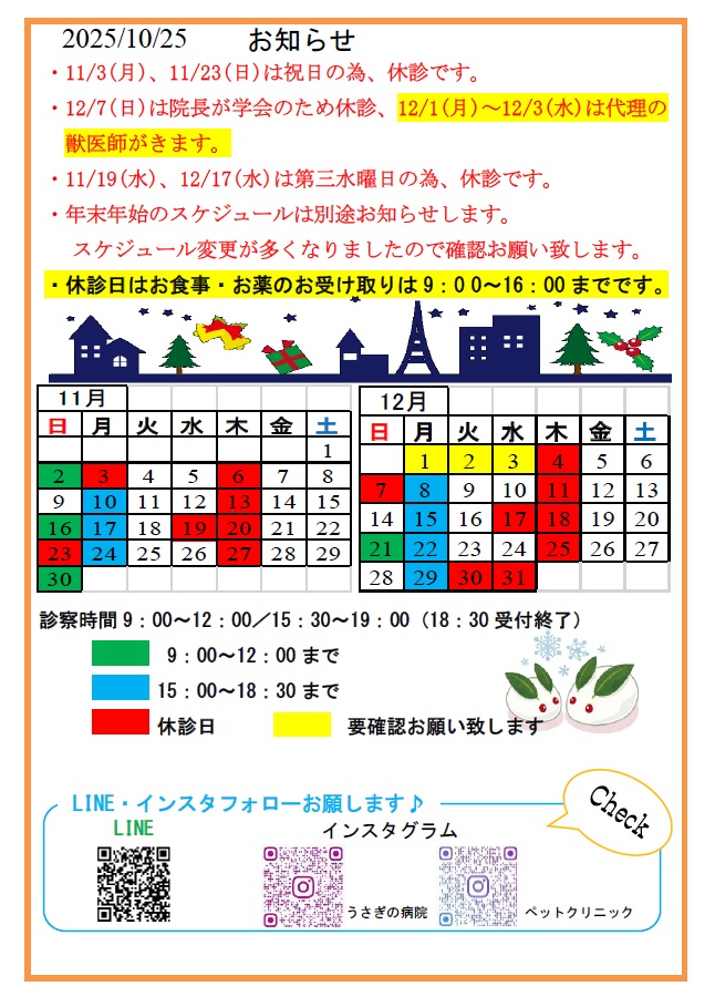 ペットクリニックから11月・12月のお知らせです🗣💬