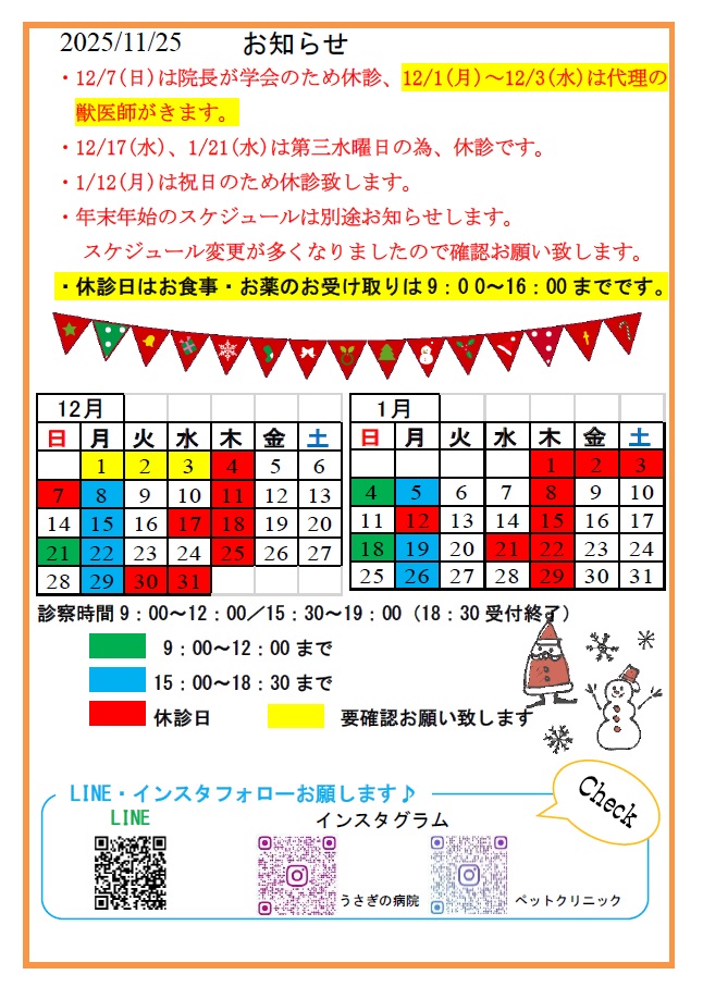 12月の診察スケジュールのお知らせ🐶🐱🐰💊